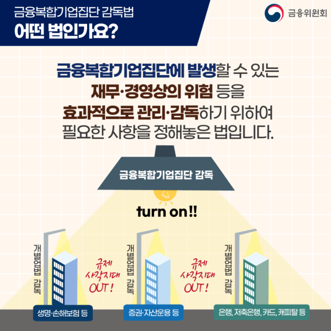 예를 들어 삼성그룹을 살펴볼까요? 삼성그룹은 보험업을 하고 있는 '삼성생명보험'과 금융투자업을 하는 '삼성증권' 그리고 여신업을 하고 있는 '삼성카드' 등 다양한 금융업을 동시에 운영하고 있어요. 그룹사 자산이 5조원 이상이고, 2가지 이상의 금융업을 운영하고 언급한 3개 회사 모두 금융위의 인허가를 받아 운영하고 있으니 금융복합기업집단의 요건을 모두 갖췄죠. 금융위원회에서는 삼성생명, 삼성증권, 삼성카드 등 금융계열사를 하나의 삼성그룹으로 묶어서 그룹 전체의 리스크를 한눈에 보고 관리하고 있어요. 왜냐하면 이런 그룹사의 경우 만약 한곳이 문제가 생기면 그 여파가 다른 계열사들에게 번질 수 있기 때문이에요. 기업의 건정성을 높이고, 금융시장 안정화는 물론 금융소비자를 보호하기 위한 제도예요.