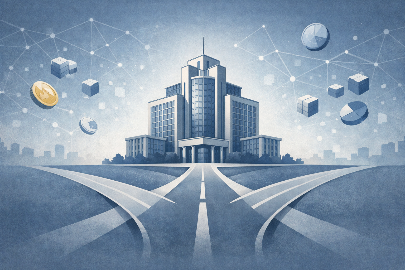 토큰증권(STO) 장외거래소 인가를 둘러싼 정책적 갈림길과 불확실성을 상징적으로 표현한 이미지 < 생성 : 챗GPT >